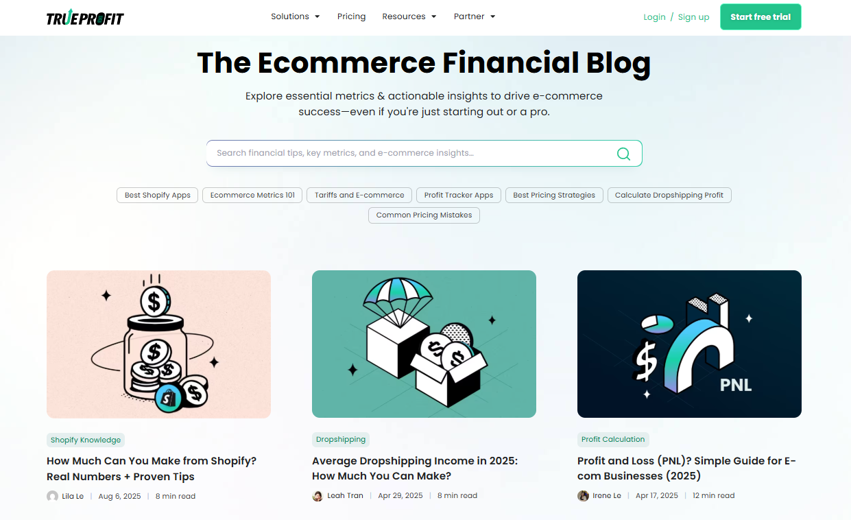 - TrueProfit Blog: Kho kiến thức về Ecommerce, Shopify, dropshipping và profit tracking, nhằm trang bị cho merchants nền tảng vững chắc.